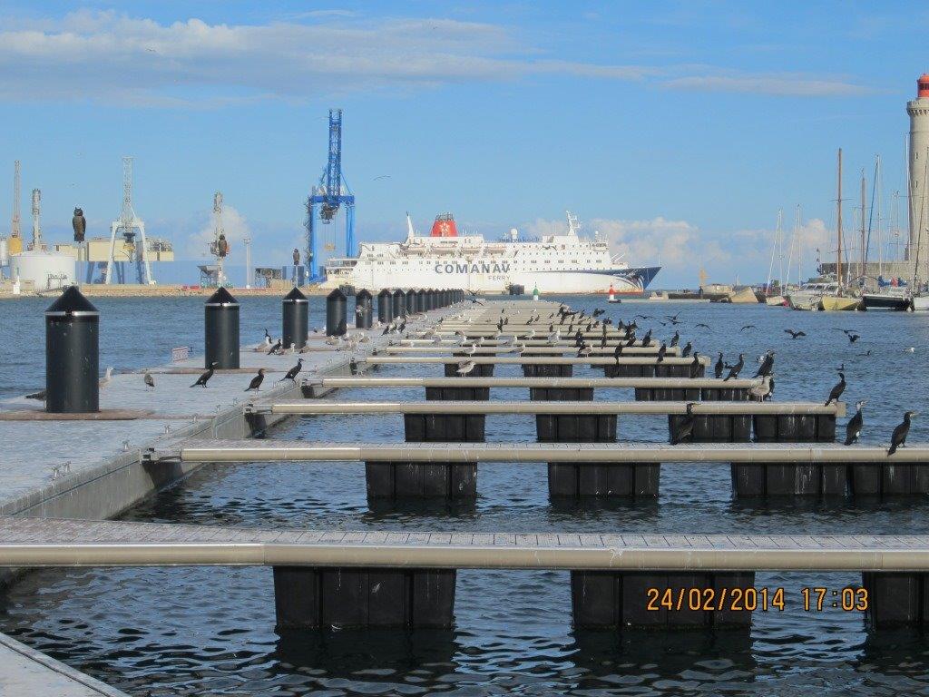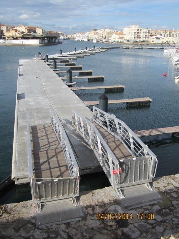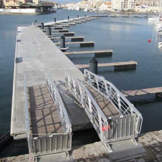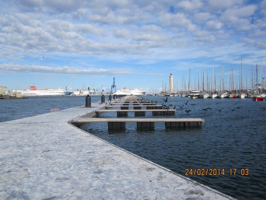 Pantalán flotante modelo SF1230 (instalados en paralelo para alcanzar 6 m de ancho) en el muelle de recepción de vedettes guiado mediante pilotes exteriores, y T400 en el dique de atenuación con pilotes internos al módulo. |